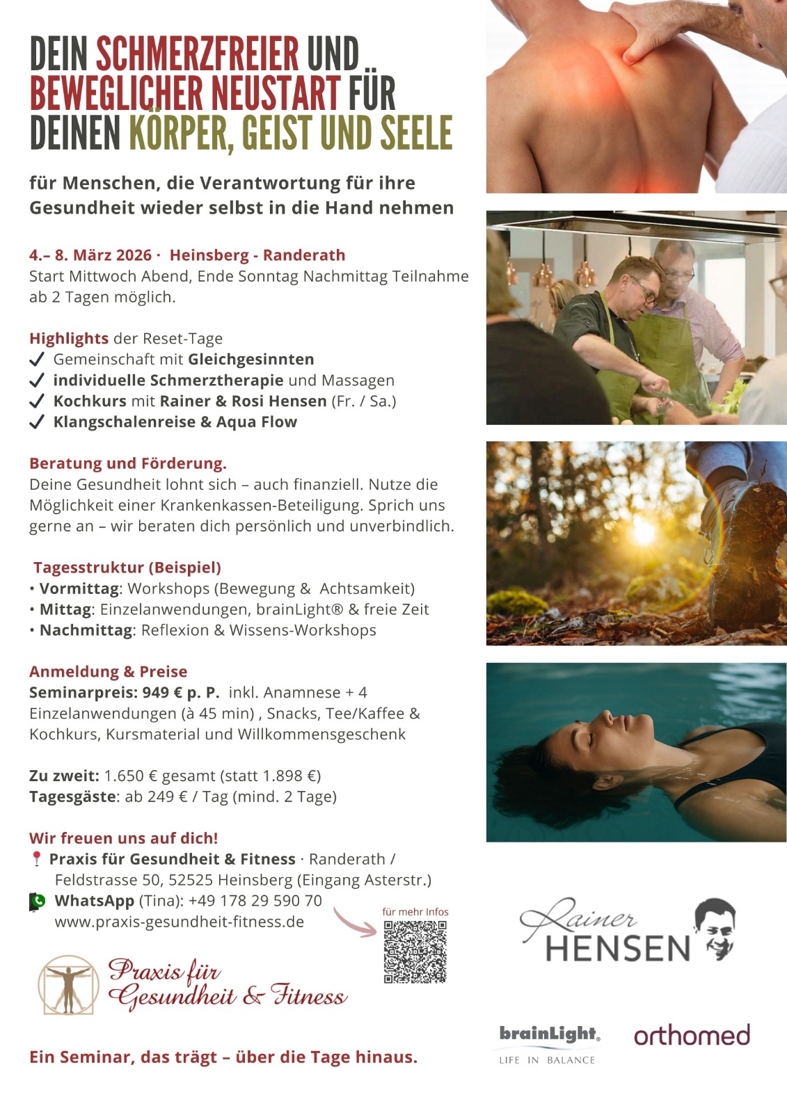 Seminarpreis: 949 € p. P. inkl. Anamnese + 4 Einzelanwendungen (à 45 min) , Snacks, Tee/Kaffee & Kochkurs, Kursmaterial und Willkommensgeschenk